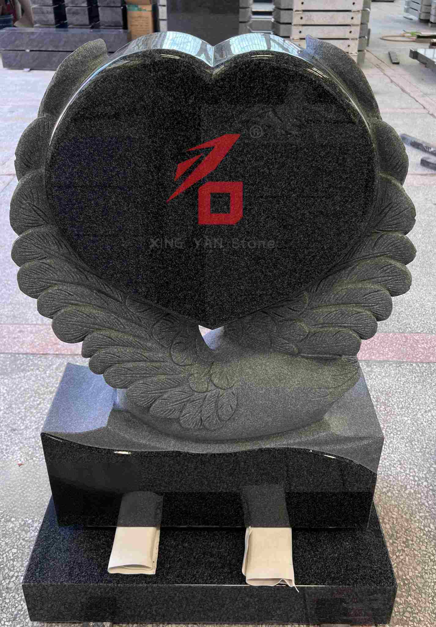 Desain: Awak utama yaiku jantung ireng sing poliran, kanthi swan swan gaya urip ing mburi. Wangun swan lan jantung minangka simbol katresnan lan pangeling-eling sing langgeng kanggo almarhum. Desain sakabèhé artis, mbedakake saka gaya monton saka tombstones tradisional.